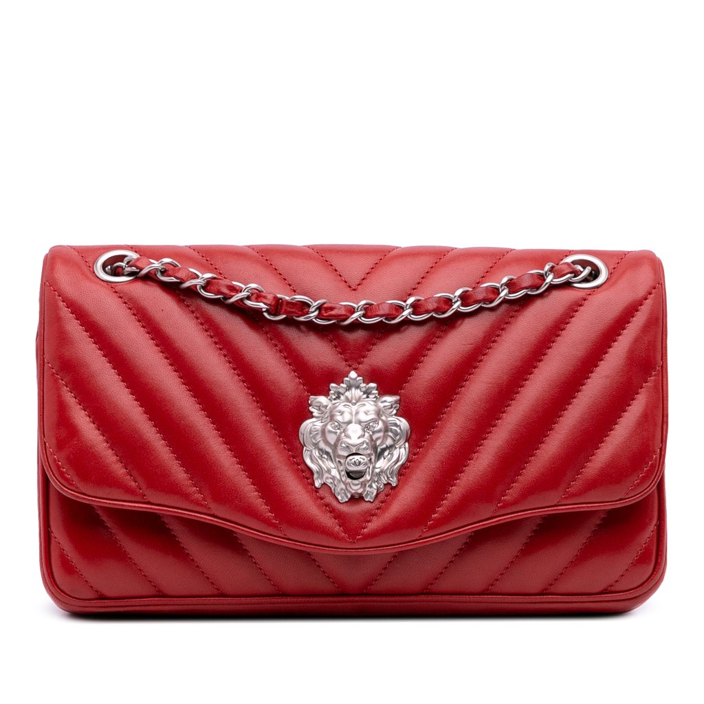 This shoulder bag features a quilted lambskin leather body, a leather woven chain shoulder strap, front flap with magnetic snap closure, an exterior back slip pocket, and interior zip and slip pockets.