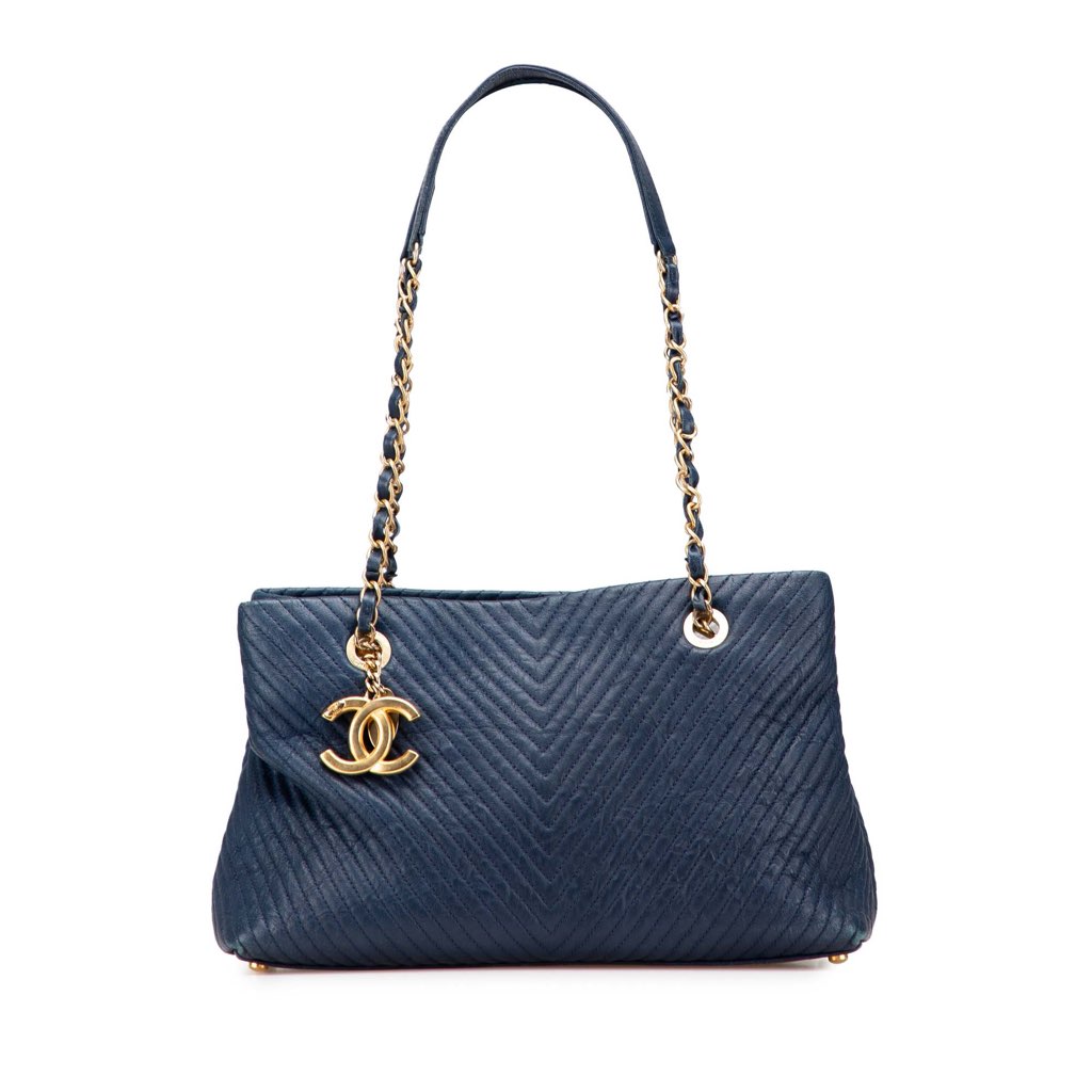 This tote features a quilted lambskin leather body, leather woven chain straps with leather guards, an open top with magnetic closure, interior zip and open compartments, and interior zip and slip pockets.