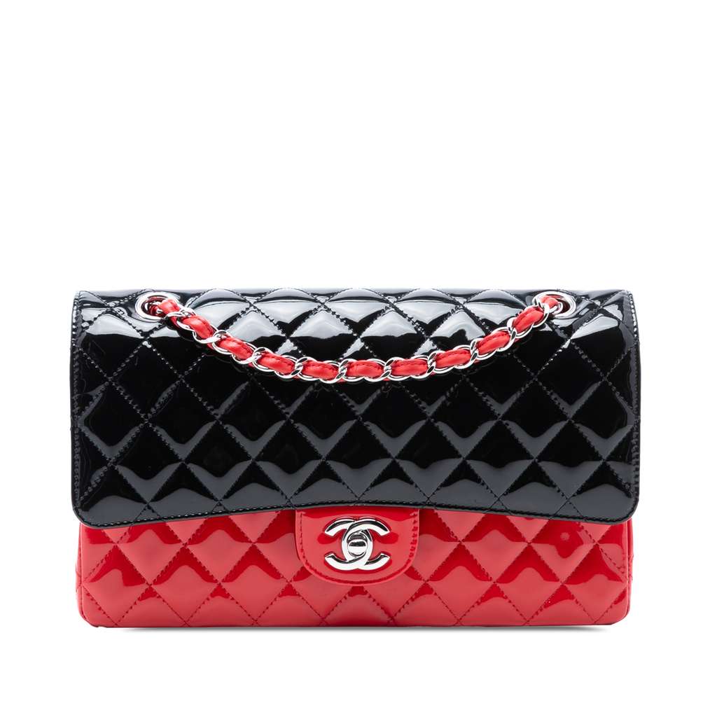 This shoulder bag features a quilted patent leather body, a leather woven chain shoulder strap, double front flaps with CC turn-lock closure, an exterior back slip pocket, and interior zip and slip pockets.