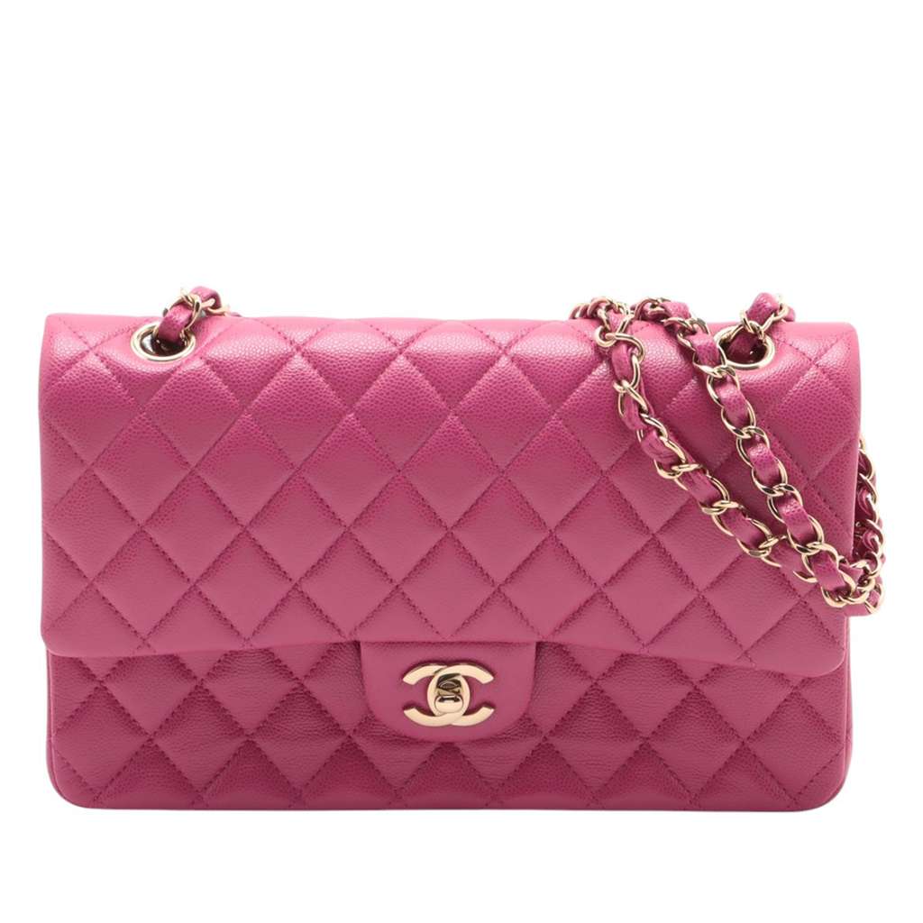 This shoulder bag features a quilted caviar leather body, a leather woven chain strap, double front flaps with CC turn-lock closure, an exterior back slip pocket, and interior zip and slip pockets.