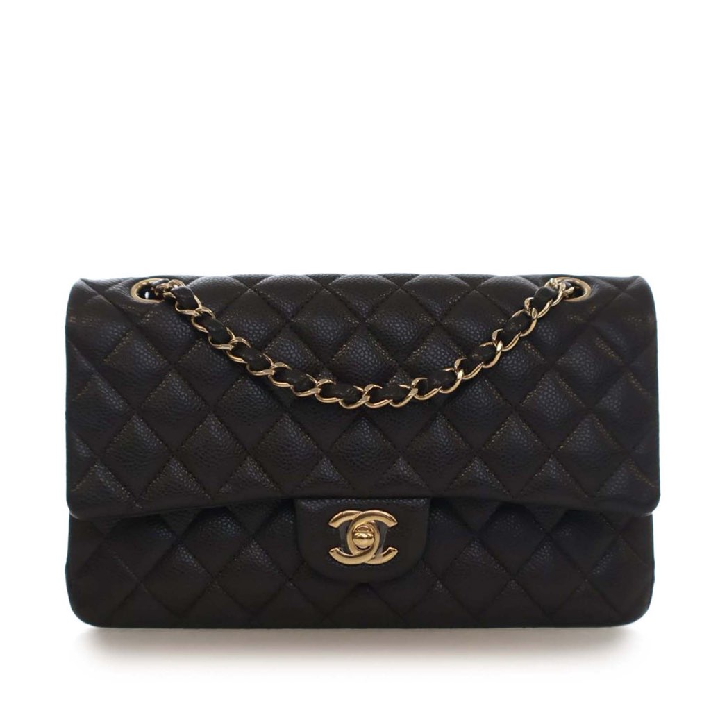 This shoulder bag features a quilted caviar leather body, leather woven chain straps, double front flaps with interlocking Cs and a twist lock closure, an exterior back slip pocket, and interior slip pockets.
