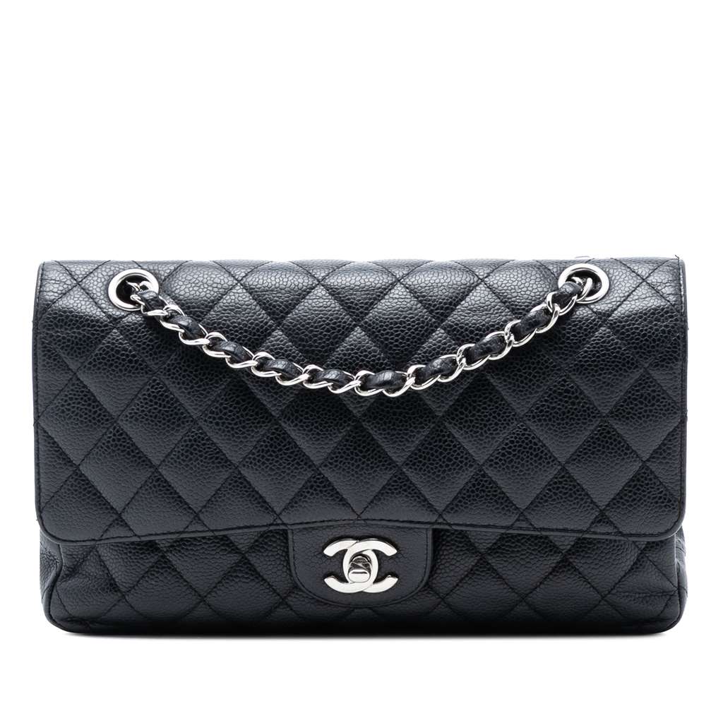 This shoulder bag features a quilted caviar leather body, an exterior back slip pocket, leather woven chain straps, double front flaps with interlocking Cs and a twist lock closure, and interior zip and slip pockets.