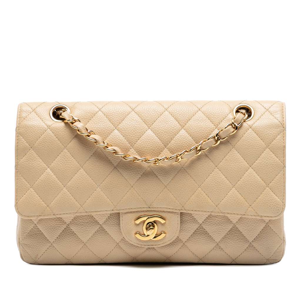 This shoulder bag features a quilted caviar leather body, a leather woven chain strap, double front flaps with CC turn-lock closure, an exterior back slip pocket, and interior slip pockets.