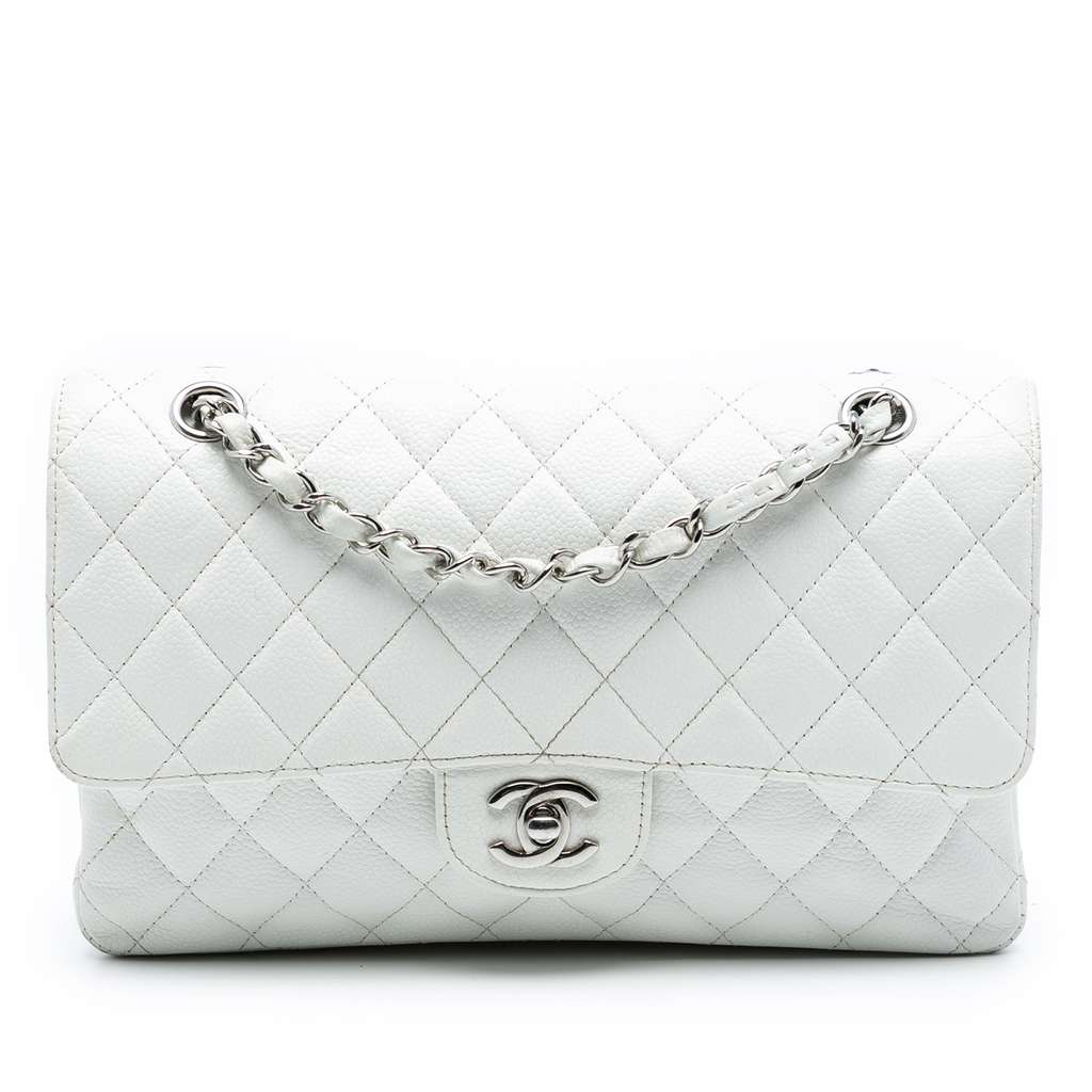This shoulder bag features a quilted caviar body, leather woven chain straps, double front flaps with interlocking Cs and a twist lock closure, an exterior back slip pocket, and interior zip and slip pockets.