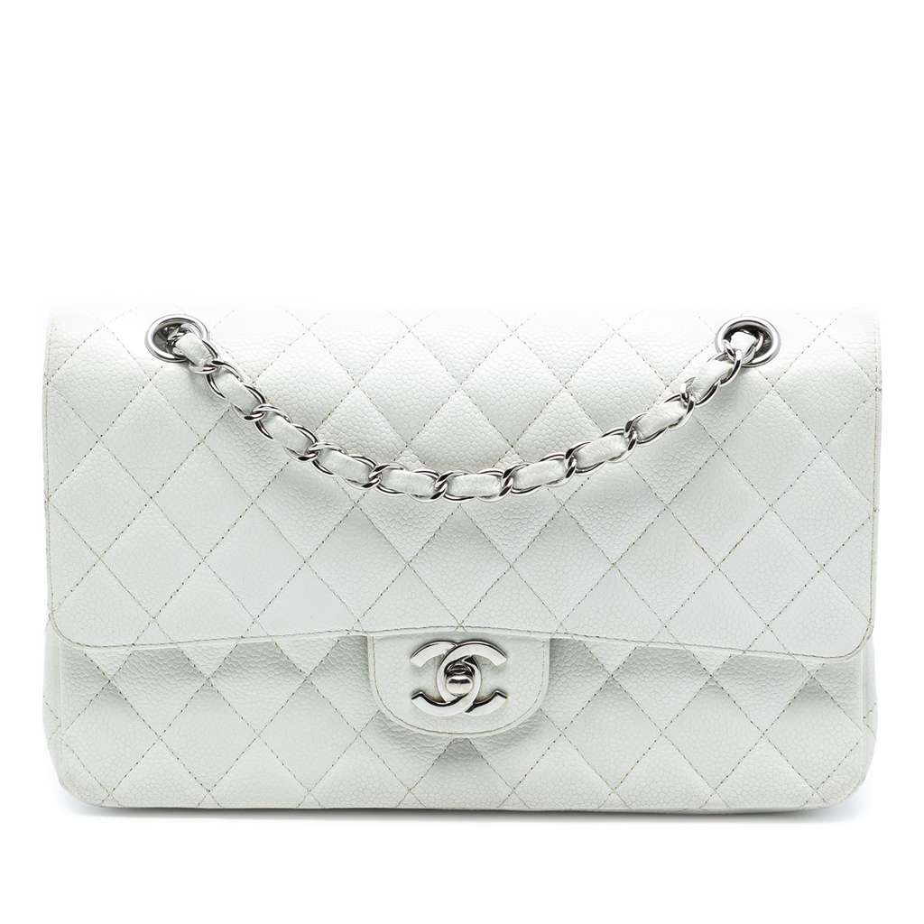 This shoulder bag features a quilted caviar body, leather woven chain straps, double front flaps with interlocking Cs and a twist lock closure, an exterior back slip pocket, and interior zip and slip pockets.