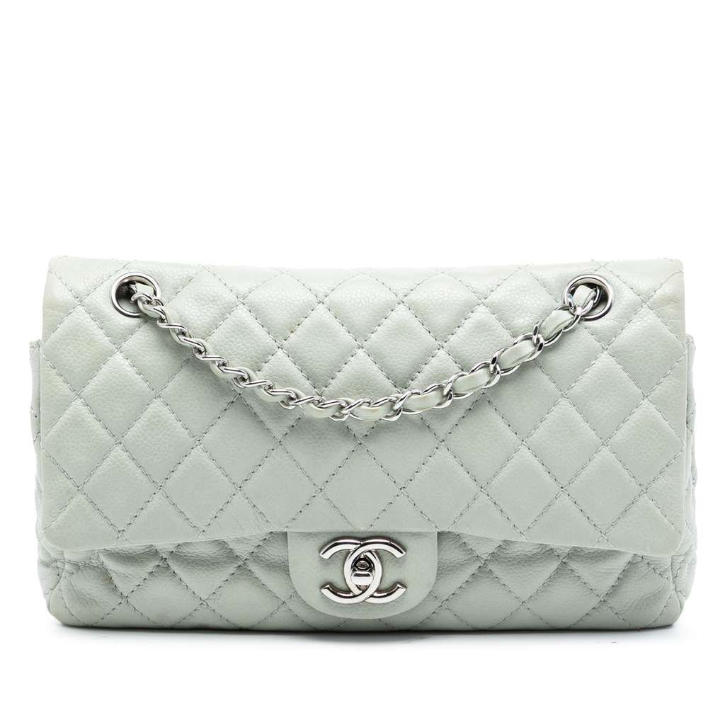 This shoulder bag features a quilted caviar body, leather woven chain straps, double front flaps with interlocking Cs and a twist lock closure, an exterior back slip pocket, and interior zip and slip pockets.