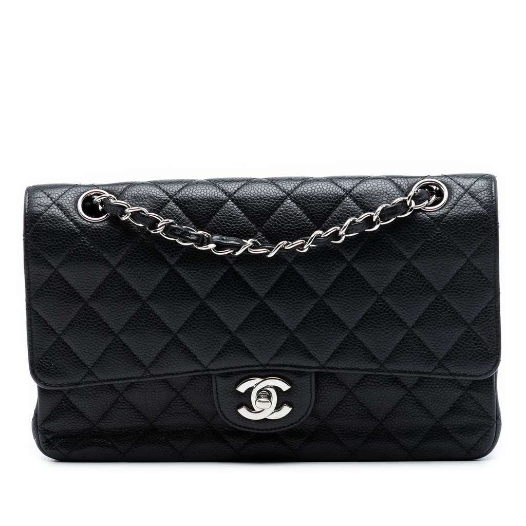 This shoulder bag features a quilted caviar leather body, leather woven chain straps, double front flaps with interlocking Cs and a twist lock closure, an exterior back slip pocket, and interior zip and slip pockets.
