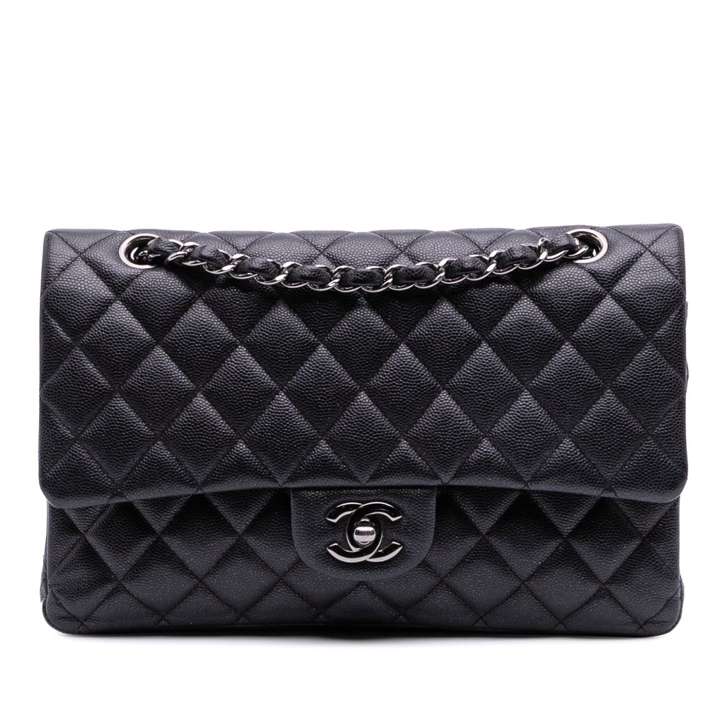 This shoulder bag features a quilted caviar leather body, an exterior back slip pocket, leather woven chain straps, double front flaps with interlocking Cs and a twist lock closure, and interior zip and slip pockets.