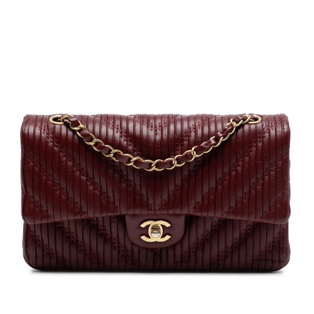 This shoulder bag features a leather body, leather woven chain link shoulder straps, front flaps with interlocking Cs and twist lock closure, an exterior back slip pocket, and interior slip pockets.