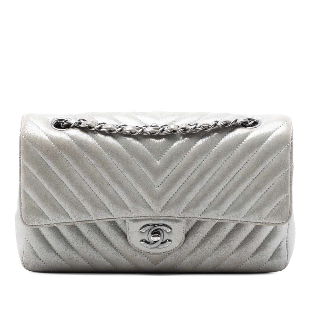 This shoulder bag features a quilted caviar leather body, leather-woven chain link shoulder strap, a double front flap with interlocking Cs and twist lock closure, an exterior back slip pocket, and interior zip and slip pockets.