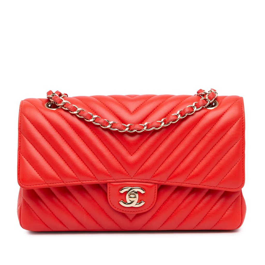 This shoulder bag features a quilted lambskin leather body, a leather woven chain shoulder strap, front flaps with interlocking Cs and twist lock closure, an exterior back slip pocket, and interior zip and slip pockets.