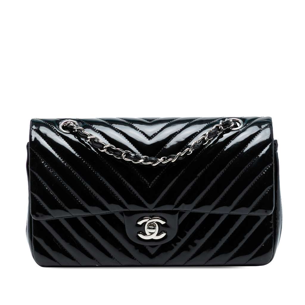 This shoulder bag features a quilted patent leather body, leather woven chain shoulder straps, front flaps with interlocking Cs and twist lock closure, an exterior back slip pocket, and interior zip and slip pockets.