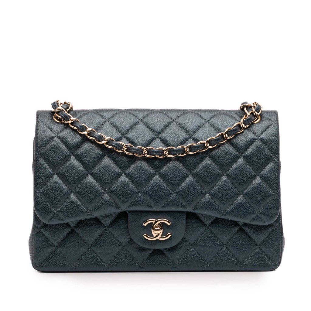 This shoulder bag features a quilted caviar leather body, leather woven chain straps, double front flaps with interlocking Cs and a twist lock closure, an exterior back slip pocket, and interior zip and slip pockets.