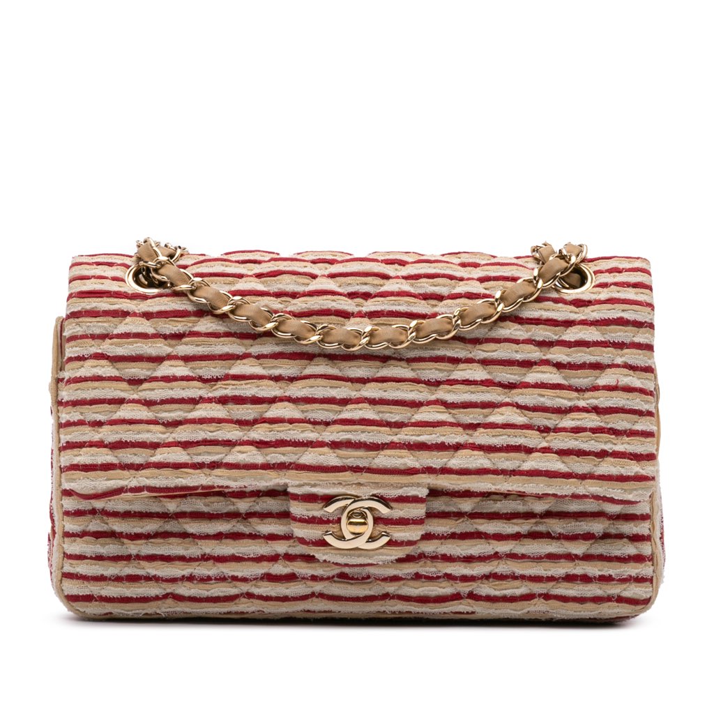 The Coco Sailor features a quilted striped jersey body, leather woven chain straps with faux pearl accents, double front flaps with a CC turn-lock closure, an exterior back slip pocket, and interior zip and slip pockets.