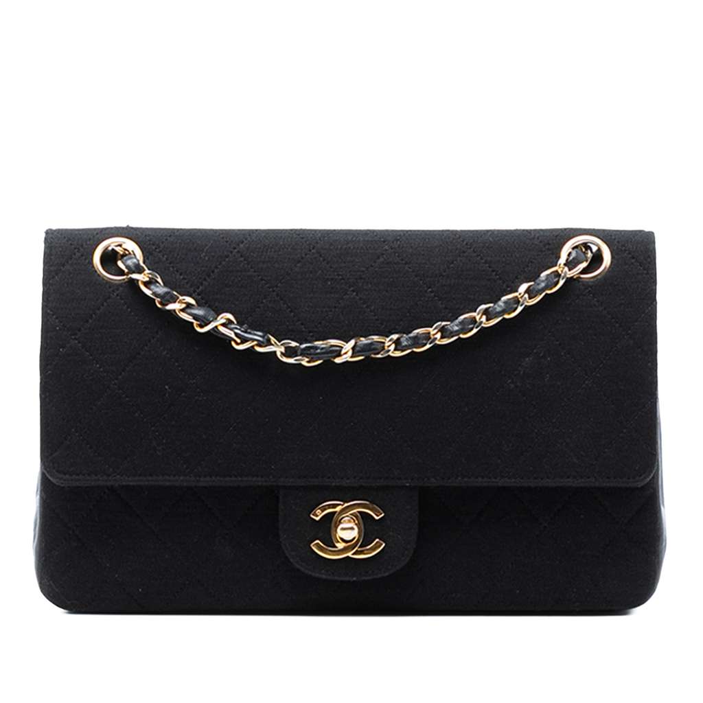 This shoulder bag features a quilted jersey body, leather woven chain shoulder straps, double flaps with CC turn-lock closure, an exterior back slip pocket, and interior zip and slip pockets.