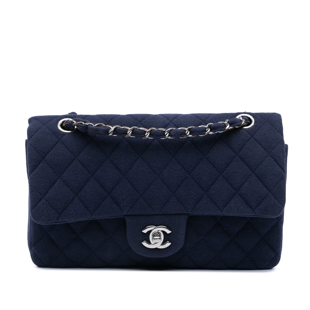 This shoulder bag features a quilted jersey body, fabric-woven chain shoulder straps, double front flaps with CC turn-lock closure, an exterior back slip pocket, and interior zip and slip pockets.