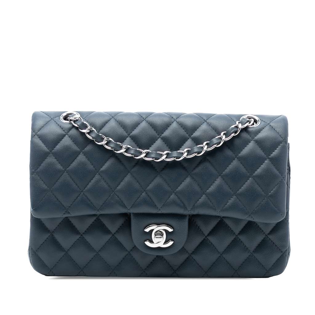 This shoulder bag features a quilted lambskin leather body, leather-woven chain straps, double front flaps with CC turn lock closure, an exterior back slip pocket, and interior zip and slip pockets. Exterior side has been repainted.