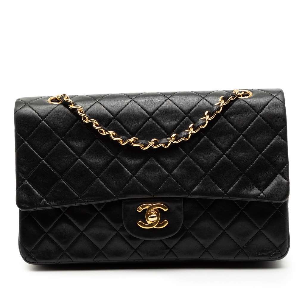 This shoulder bag features a quilted lambskin body, an exterior back slip pocket, leather woven chain straps, double front flaps with interlocking Cs and a twist lock closure, and interior zip and slip pockets.