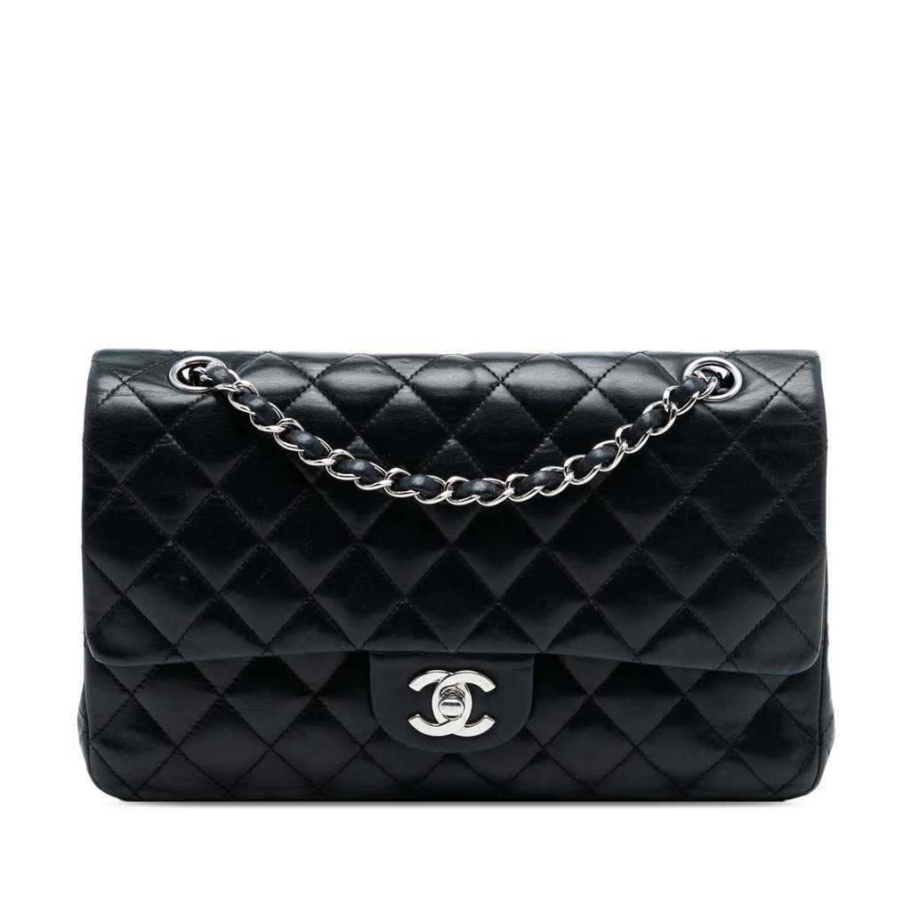 This shoulder bag features a quilted lambskin body, leather woven chain link straps, double front flaps with interlocking Cs and a twist lock closure, an exterior back slip pocket, and interior zip and slip pockets.