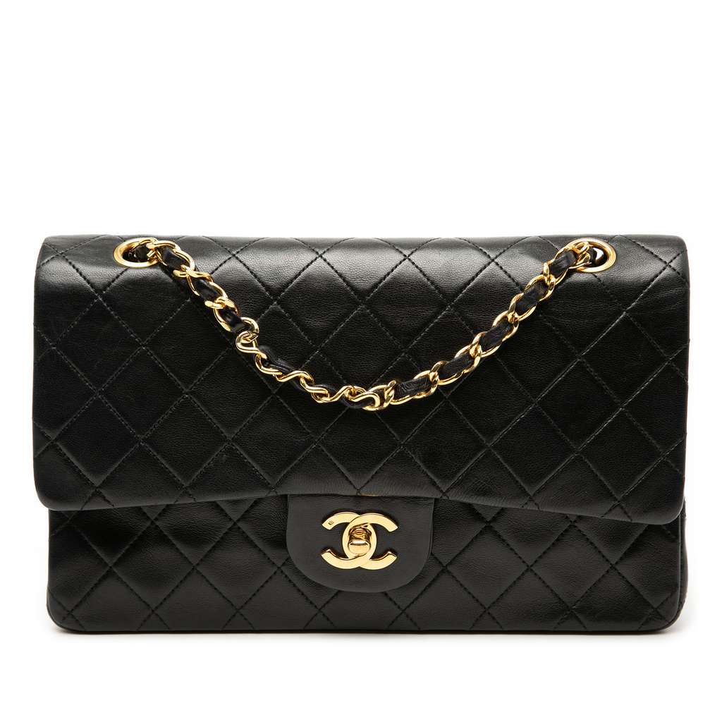 This shoulder bag features a quilted lambskin body, an exterior back slip pocket, leather woven chain straps, double front flaps with interlocking Cs and a twist lock closure, and interior slip pockets.