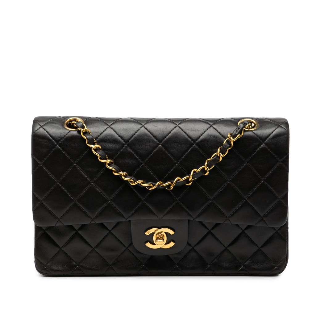 This shoulder bag features a quilted lambskin body, leather woven chain straps, double front flaps with interlocking Cs and a twist lock closure, an exterior back slip pocket, and interior slip pockets.