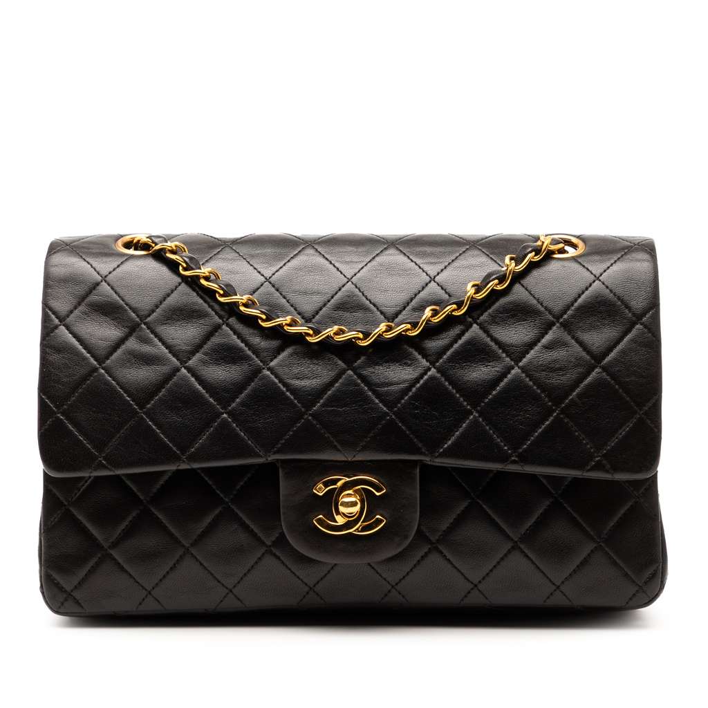 This shoulder bag features a quilted lambskin body, a gold-tone leather woven chain straps, double front flaps with interlocking Cs and a twist lock closure, an exterior back slip pocket, and interior zip and slip pockets.