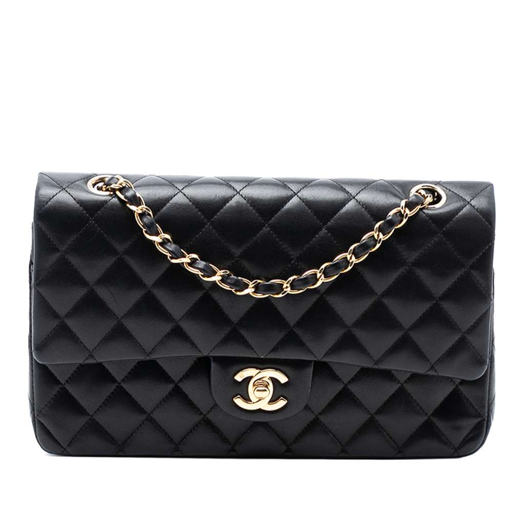 This shoulder bag features a quilted lambskin body, leather woven chain straps, double front flaps with interlocking Cs and a twist lock closure, an exterior back slip pocket, and interior zip and slip pockets.