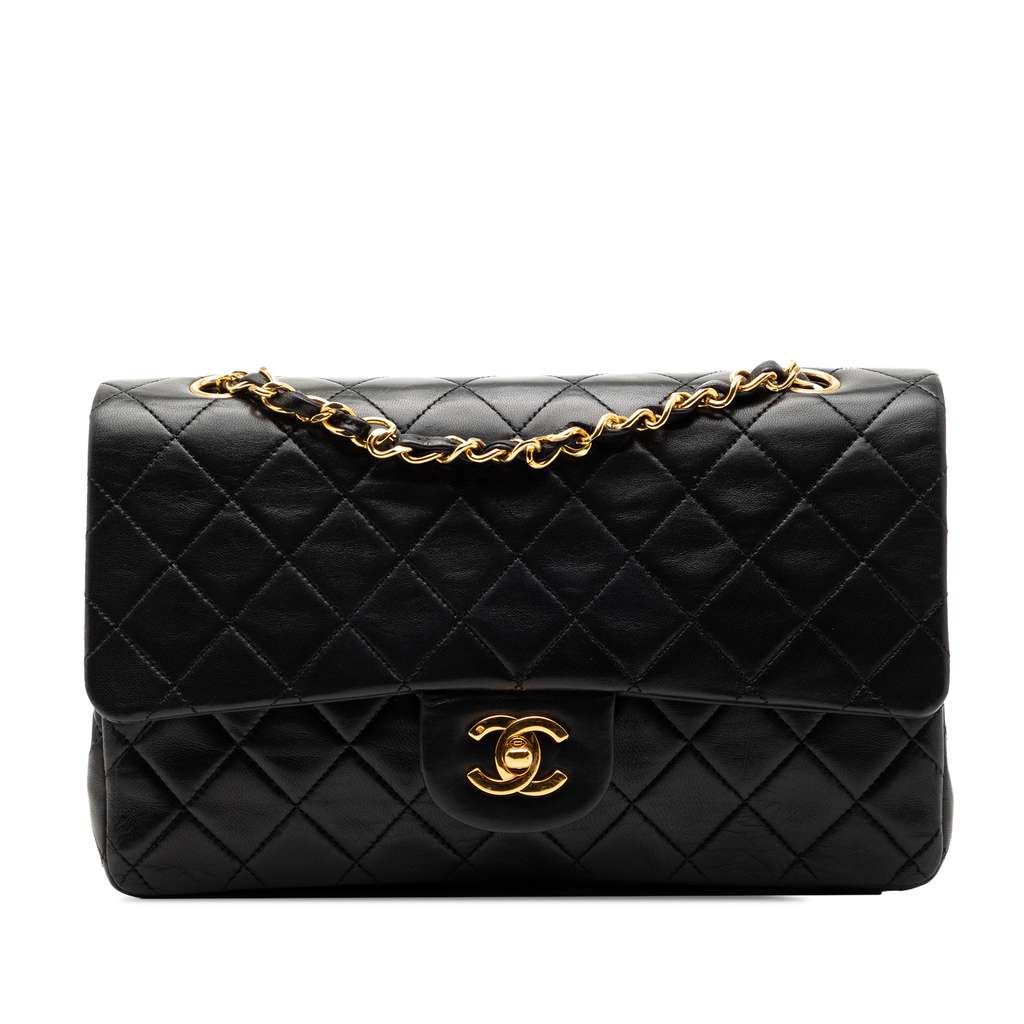 This shoulder bag features a quilted lambskin body, leather woven chain-link straps, double front flaps with interlocking Cs and a twist lock closure, an exterior back slip pocket, and interior slip pockets.