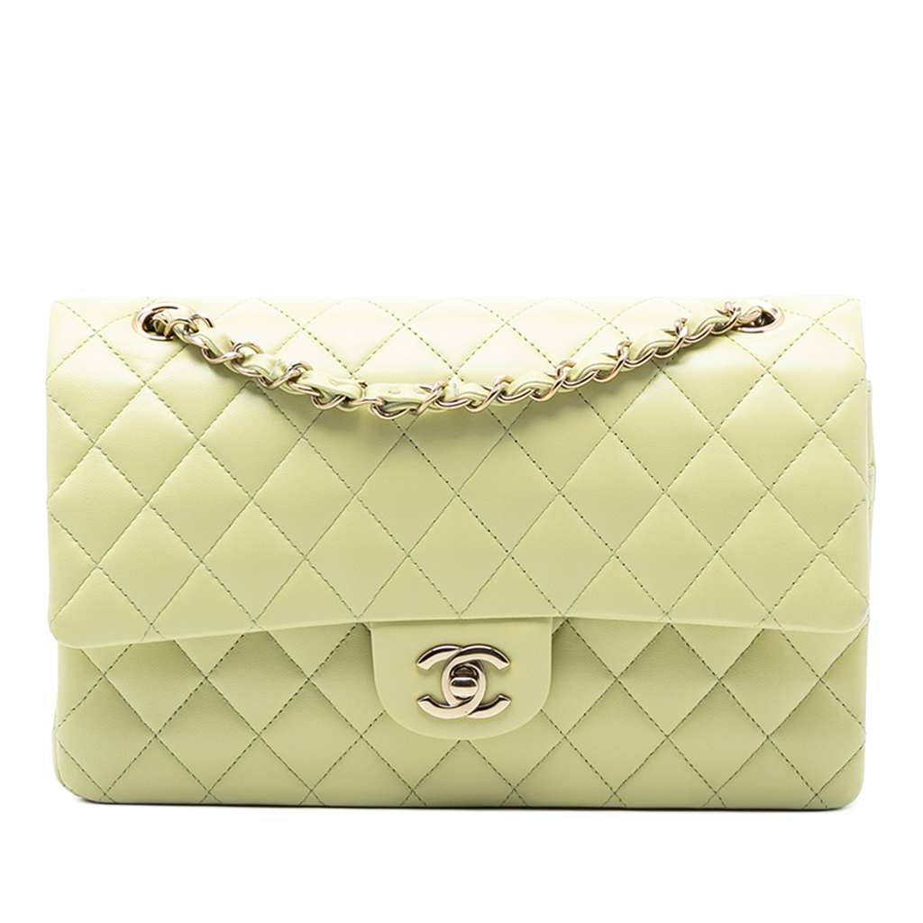 This shoulder bag features a quilted lambskin leather body, a gold-tone leather woven chain link straps, double front flaps with interlocking Cs and a twist lock closure, an exterior back slip pocket, and interior zip and slip pockets.