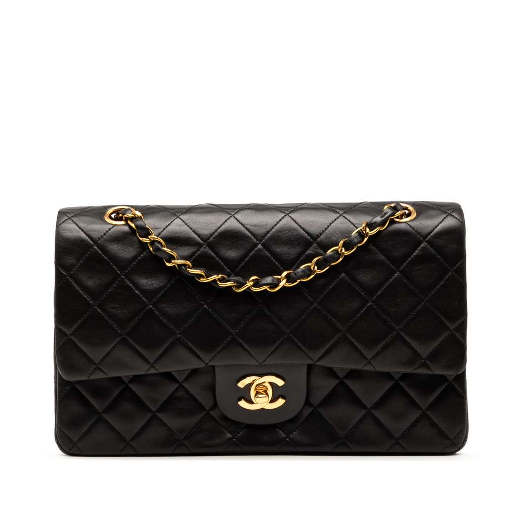This shoulder bag features a quilted lambskin body, leather woven chain link straps, double front flaps with interlocking Cs and a twist lock closure, an exterior back slip pocket, and interior slip pockets.