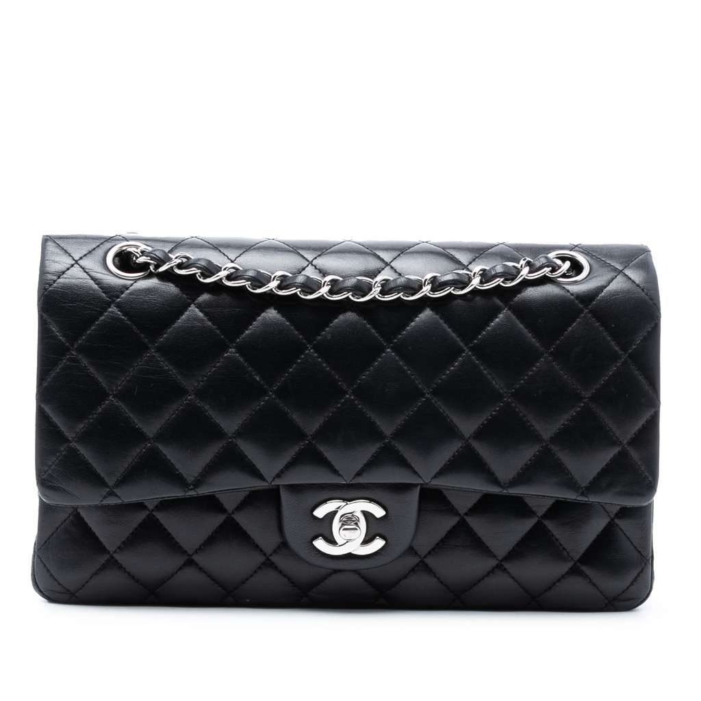 This shoulder bag features a quilted lambskin body, a back exterior slip pocket, leather woven chain straps, double front flaps with interlocking Cs and a twist lock closure, and interior slip pockets.
