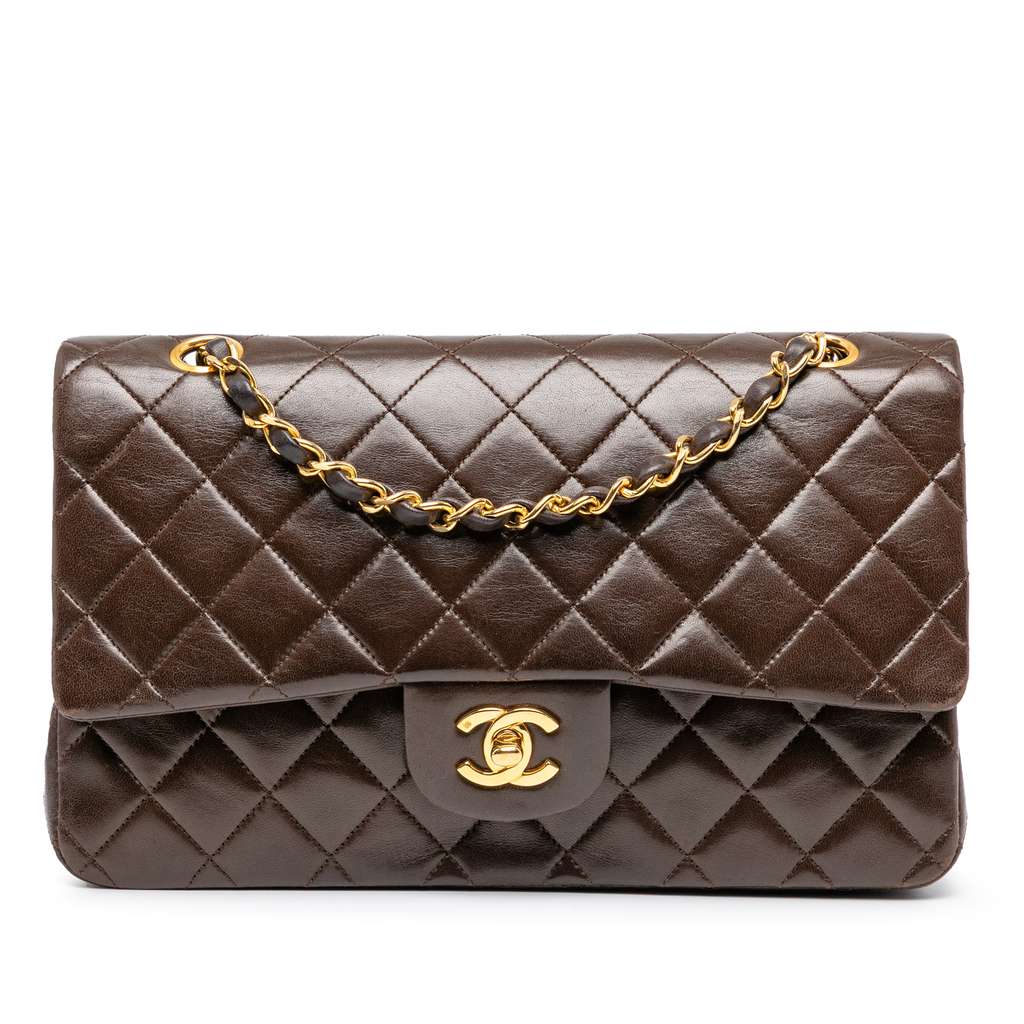 This shoulder bag features a quilted lambskin body, an exterior back slip pocket, leather woven chain straps, double front flaps with interlocking Cs and a twist lock closure, and interior zip and slip pockets.