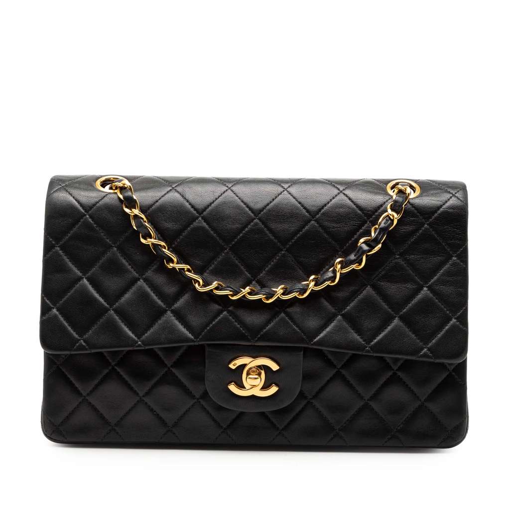 This shoulder bag features a quilted lambskin body, leather woven chain straps, double front flaps with interlocking Cs and a twist lock closure, an exterior back slip pocket, and interior zip and slip pockets.