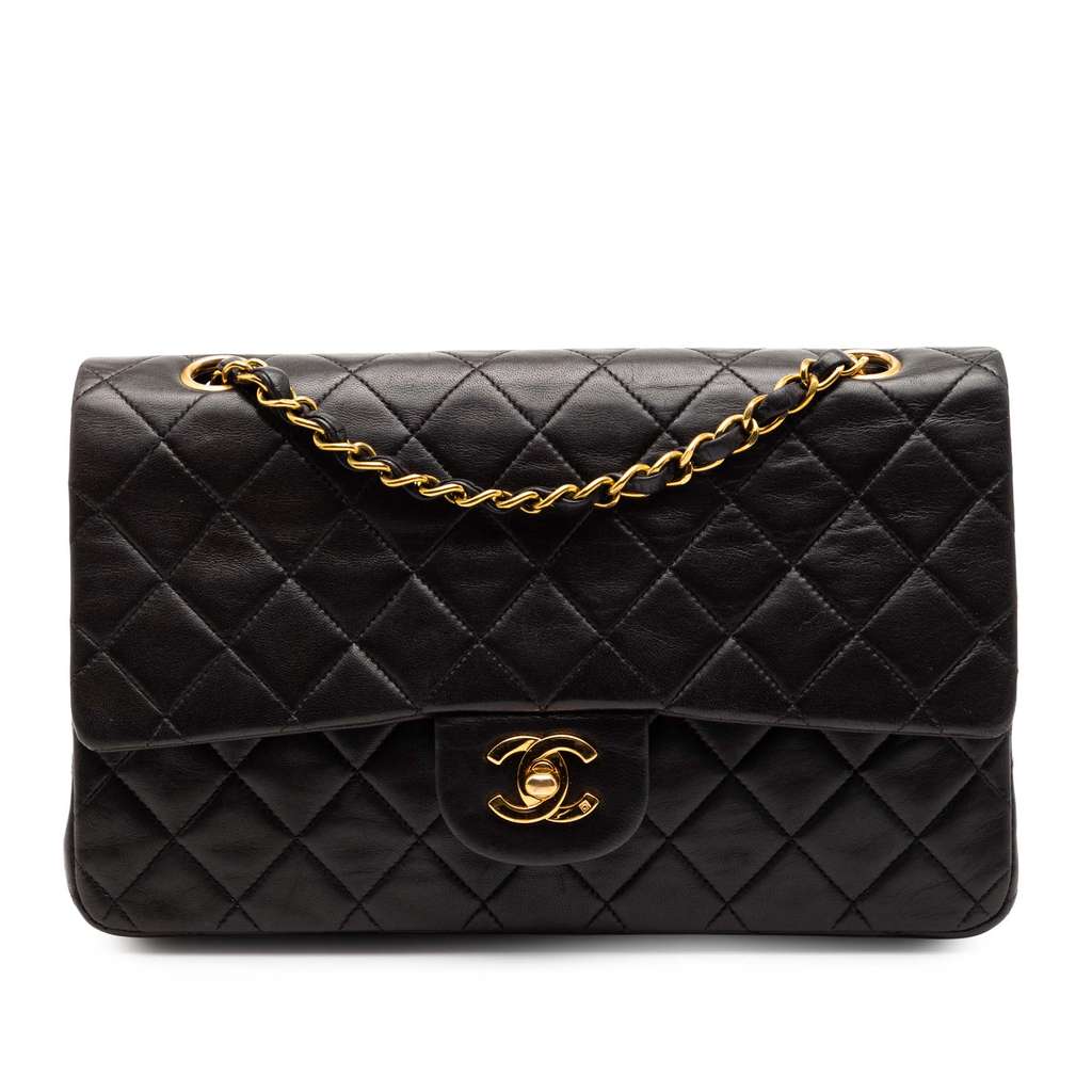 This shoulder bag features a quilted lambskin body, leather woven chain straps, double front flaps with interlocking Cs and a twist lock closure, an exterior back slip pocket and interior zip and slip pockets.