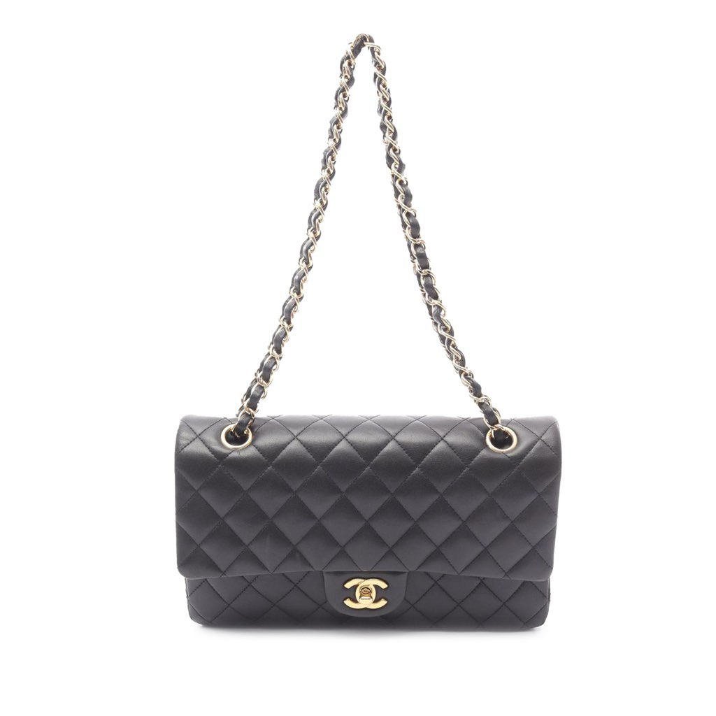 This shoulder bag features a quilted lambskin body, an exterior back slip pocket, gold-tone leather woven chain link shoulder straps, double front flaps with interlocking Cs and a twist lock closure, and interior zip and slip pockets.