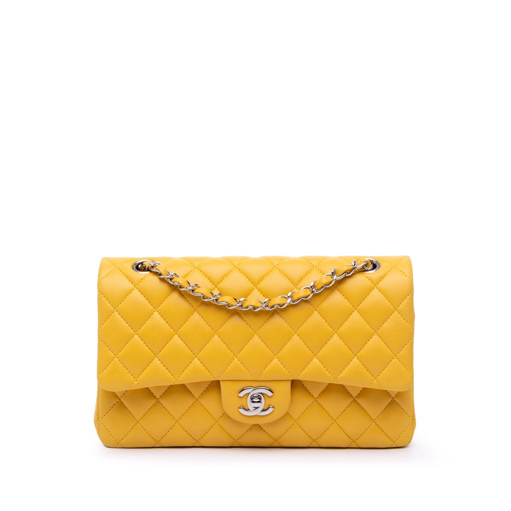 This shoulder bag features a quilted lambskin leather body, leather-woven chain straps, double front flaps with CC turn lock closure, an exterior back slip pocket, and interior zip and slip pockets.