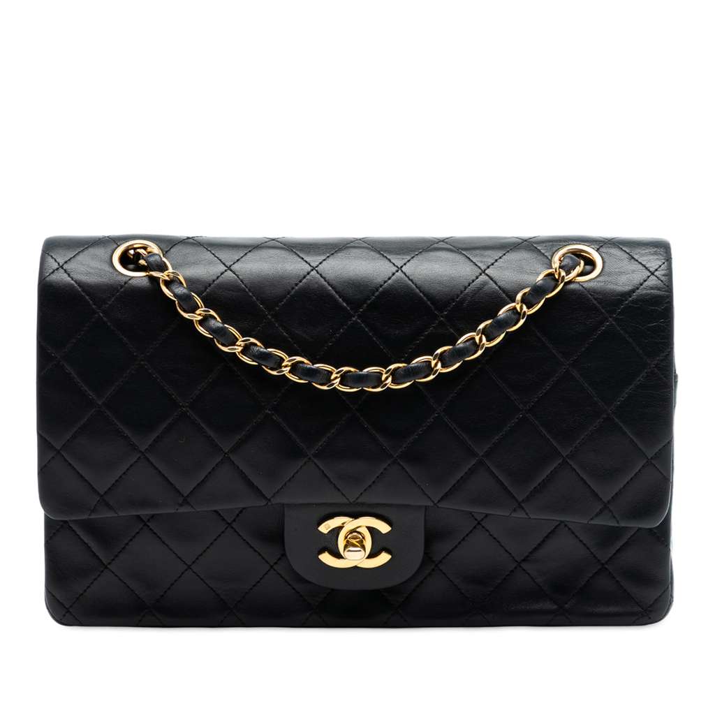 This shoulder bag features a quilted lambskin body, leather woven chain straps, double front flaps with interlocking Cs and a twist lock closure, an exterior back slip pocket, and interior zip and slip pockets.