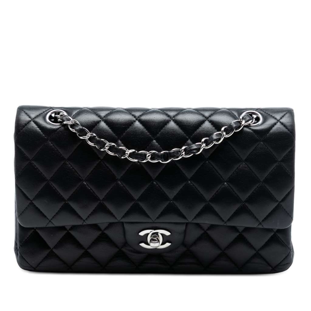 This shoulder bag features a quilted lambskin body, a back exterior slip pocket, leather woven chain straps, double front flaps with interlocking Cs and a twist lock closure, and interior zip and slip pockets.