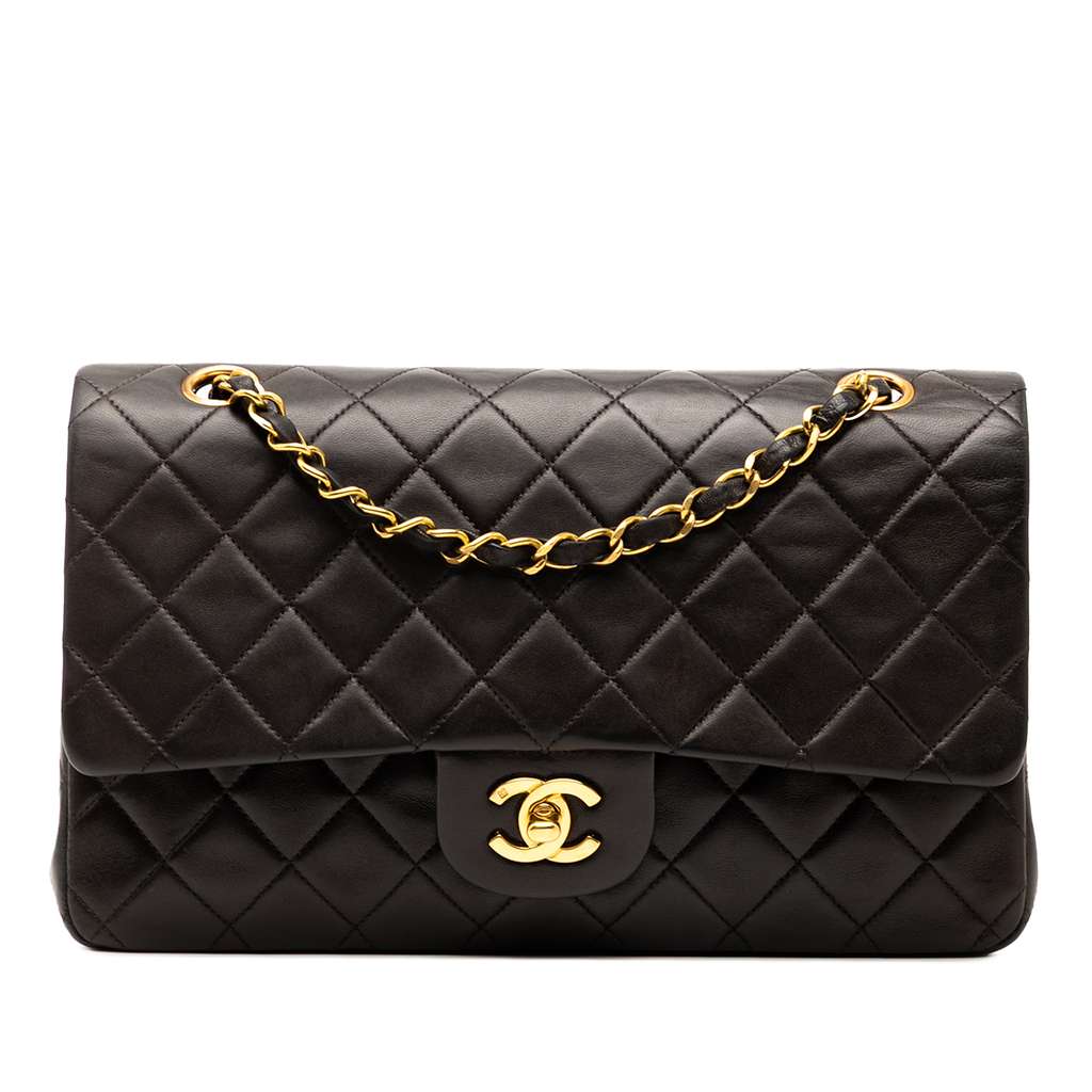 This shoulder bag features a quilted lambskin leather body, leather woven chain straps, double front flaps with interlocking Cs and a twist lock closure, an exterior back slip pocket, and interior zip and slip pockets.