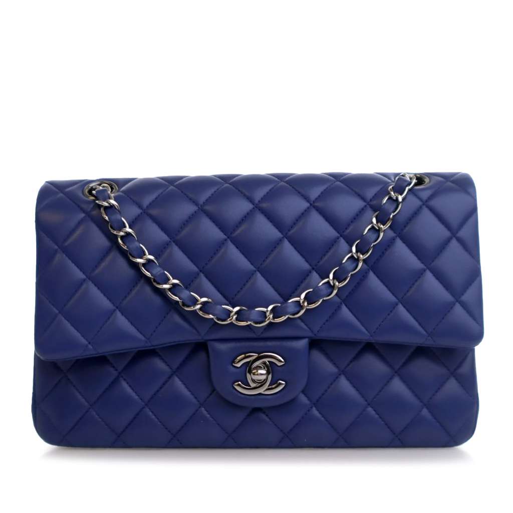 This shoulder bag features a quilted lambskin body, leather woven chain straps, double front flaps with interlocking Cs and a twist lock closure, an exterior back slip pocket, and interior zip and slip pockets.