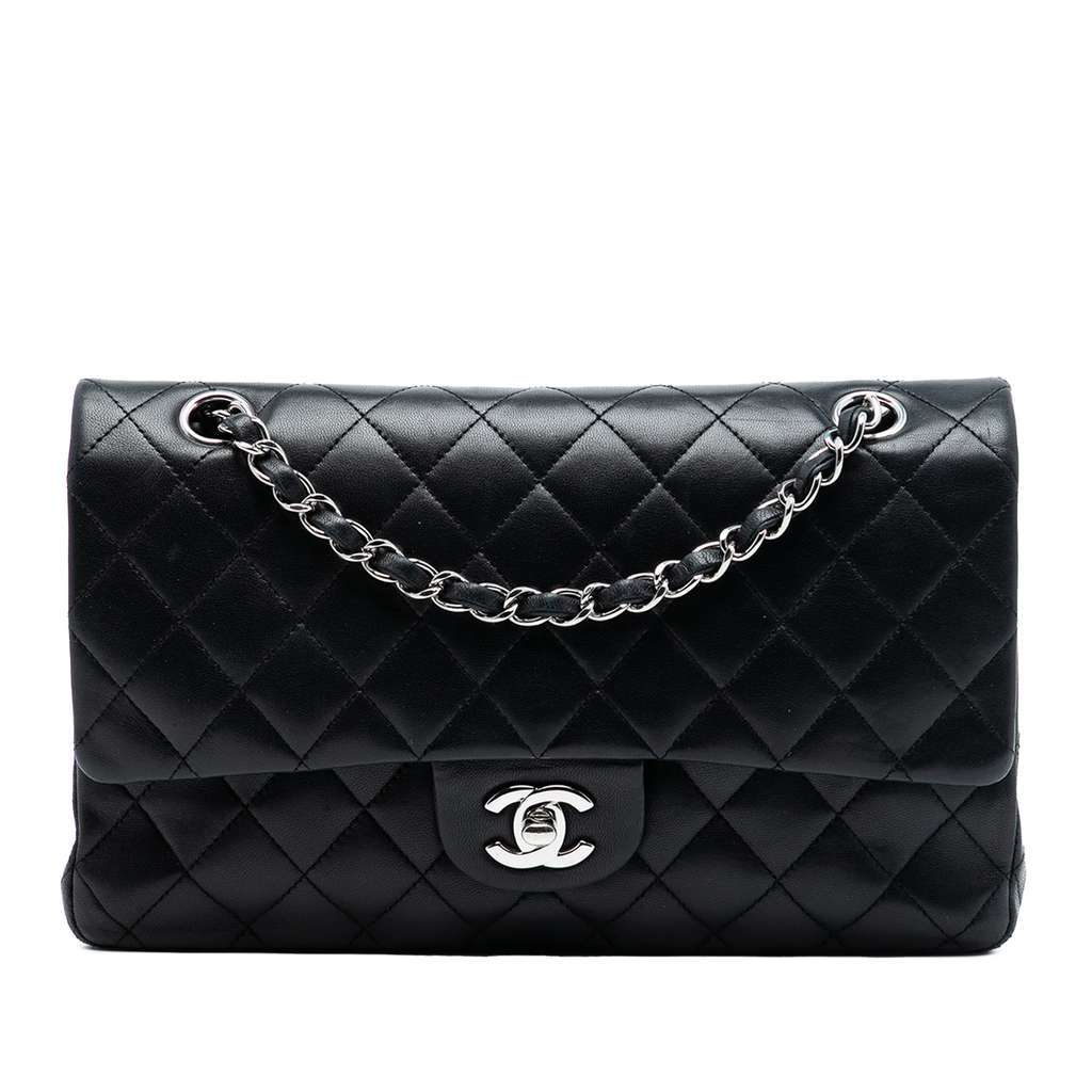 This shoulder bag features a quilted lambskin body, a back exterior slip pocket, leather woven chain straps, double front flaps with interlocking Cs and a twist lock closure, and interior zip and slip pockets.