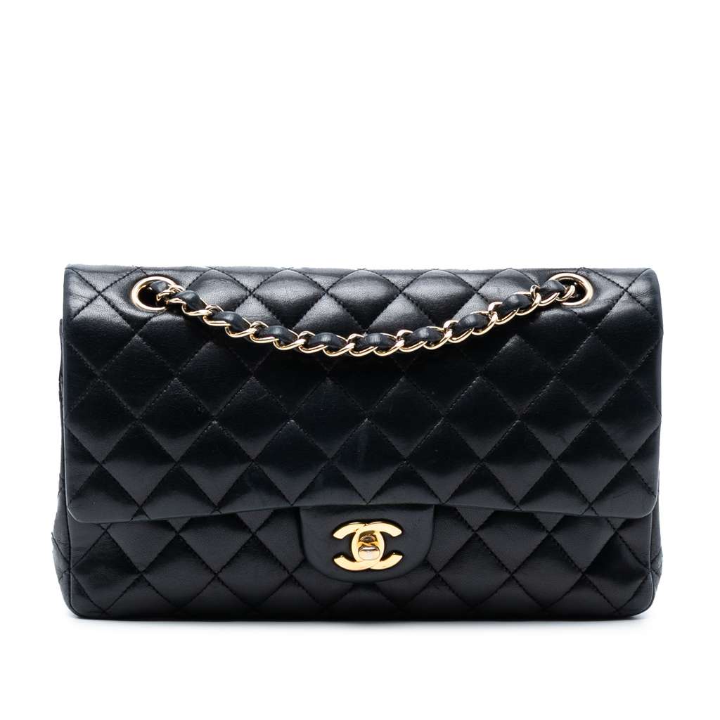 This shoulder bag features a quilted lambskin body, leather woven chain link straps, double front flaps with interlocking Cs and a twist lock closure, an exterior back slip pocket, and interior slip pockets.