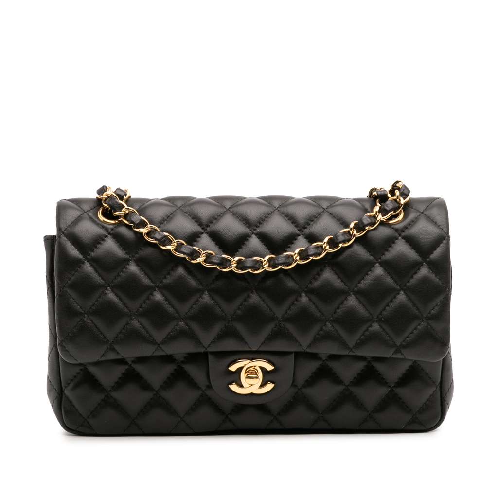 This shoulder bag features a quilted lambskin body, an exterior back slip pocket, leather woven chain straps, double front flaps with interlocking Cs and a twist lock closure, and interior zip and slip pockets.
