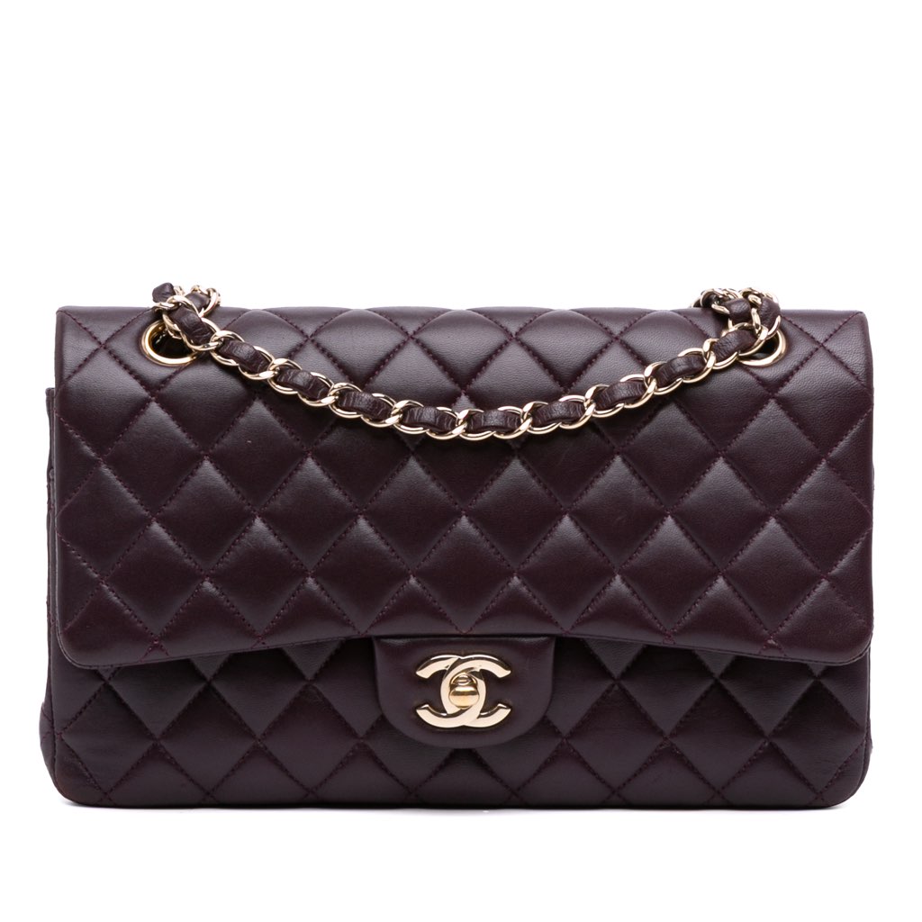 This shoulder bag features a quilted lambskin leather body, leather woven chain straps, double front flaps with interlocking Cs and a twist lock closure, an exterior back slip pocket, and interior zip and slip pockets.