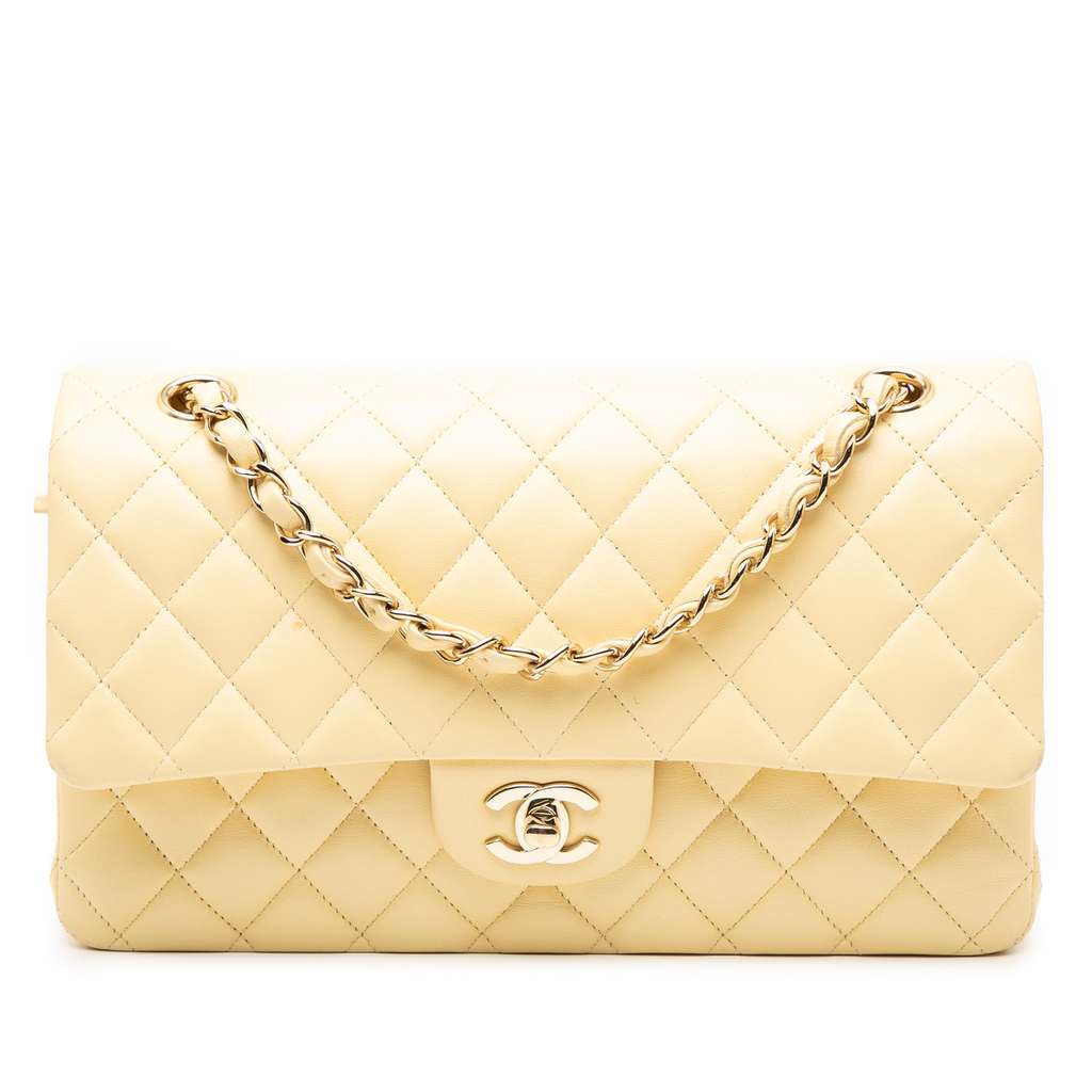 This shoulder bag features a quilted lambskin leather body, leather-woven chain straps, double front flaps with CC turn lock closure, an exterior back slip pocket, and interior zip and slip pockets.
