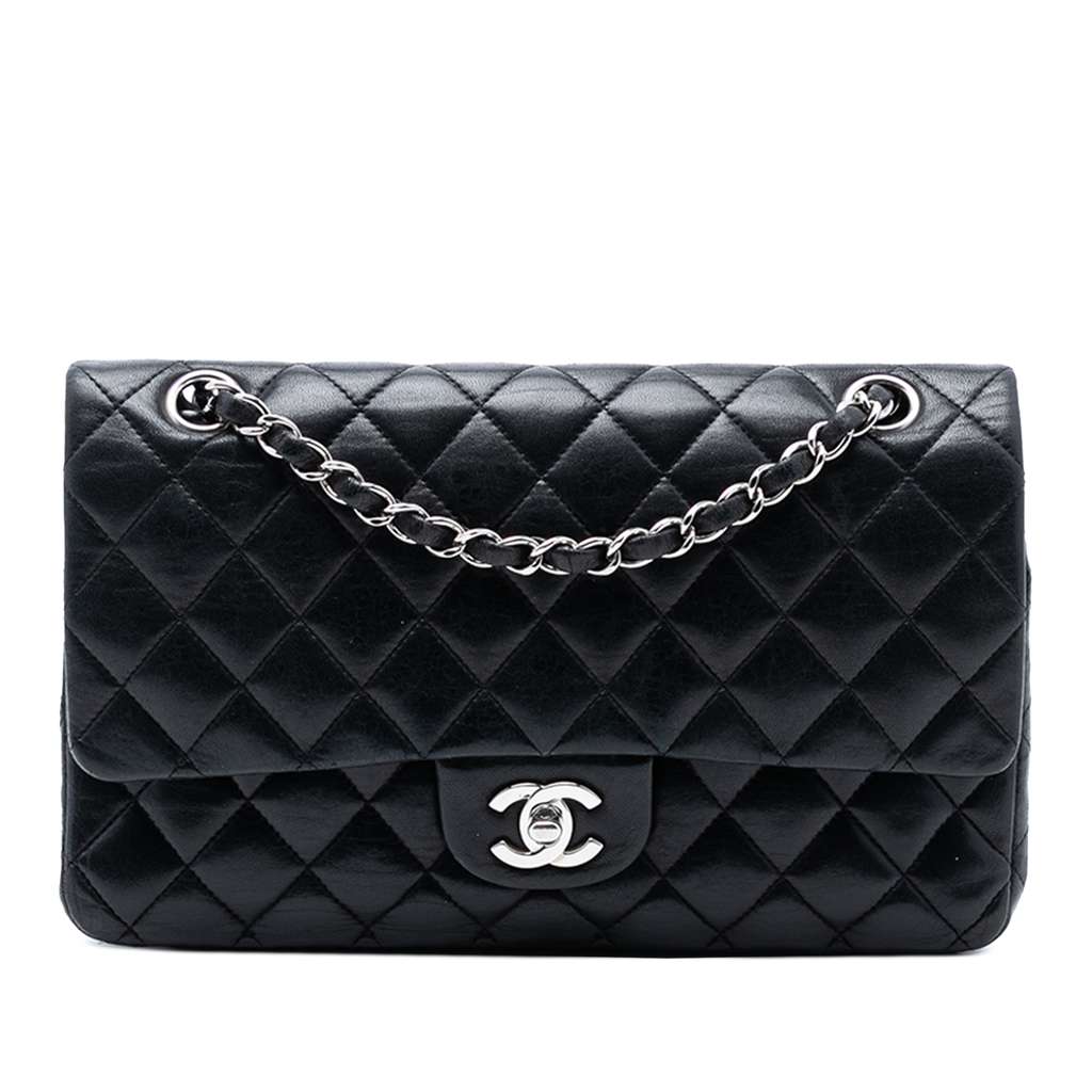 This shoulder bag features a quilted lambskin body, leather woven chain straps, double front flaps with interlocking Cs and a twist lock closure, an exterior back slip pocket, and interior zip and slip pockets.
