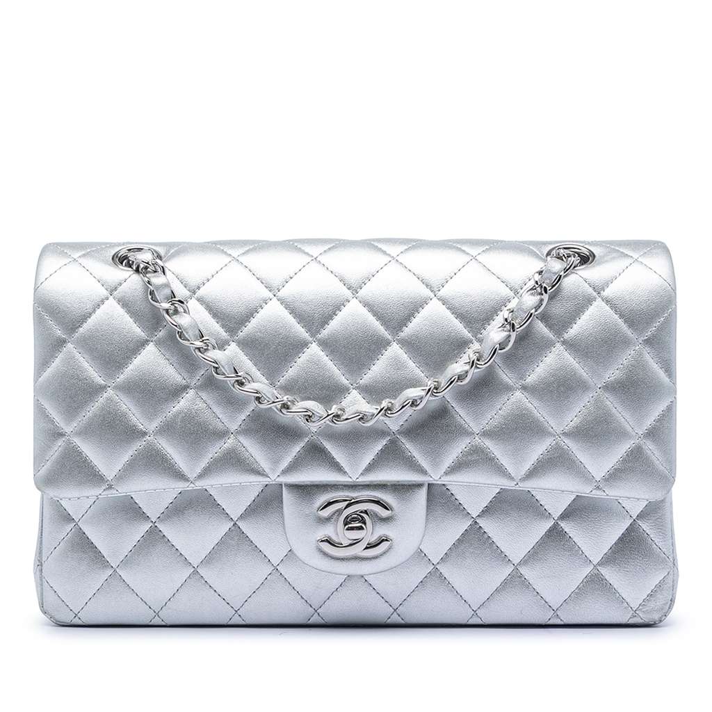 Chanel Medium Classic Metallic Lambskin Double Flap Silver M