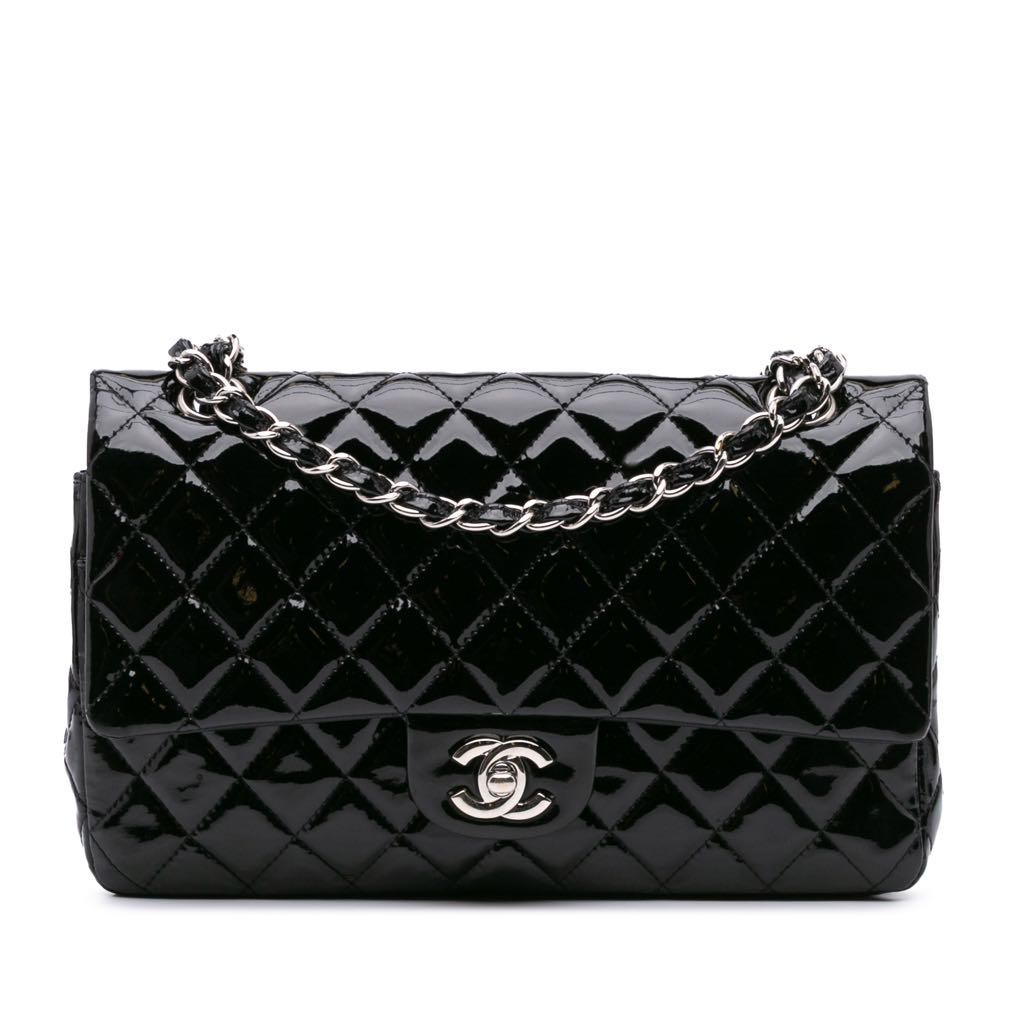 This shoulder bag features a quilted patent leather body, leather woven chain shoulder straps, double front flaps with CC turn-lock closure, an exterior back slip pocket, and interior zip and slip pockets.