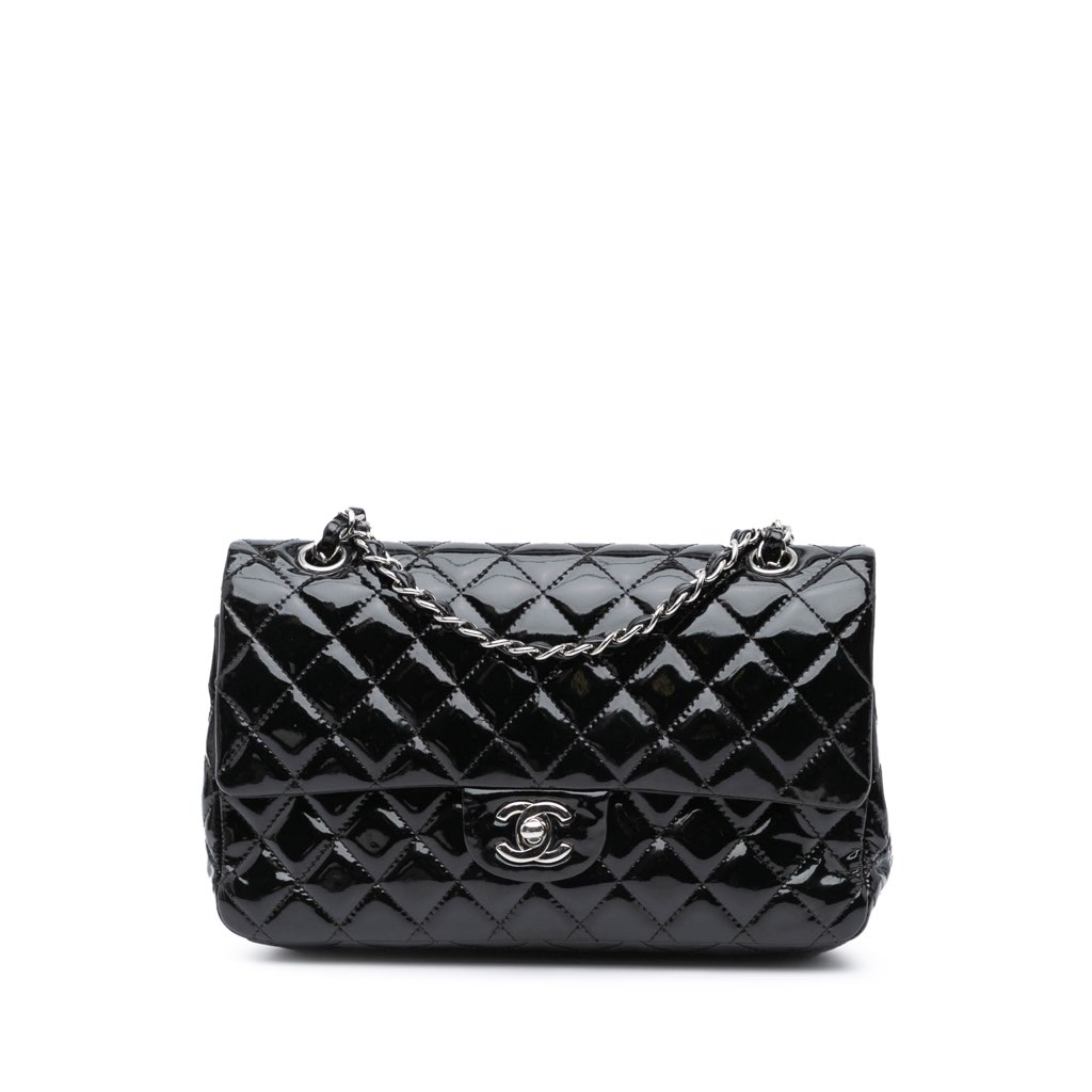 This shoulder bag features a quilted patent leather body, leather woven chain shoulder straps, double front flaps with CC turn-lock closure, an exterior back slip pocket, and interior zip and slip pockets.