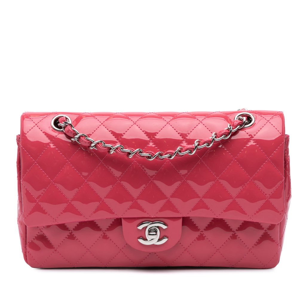 This shoulder bag features a quilted patent leather body, leather woven chain shoulder straps, double front flaps with CC turn-lock closure, an exterior back slip pocket, and interior zip and slip pockets.